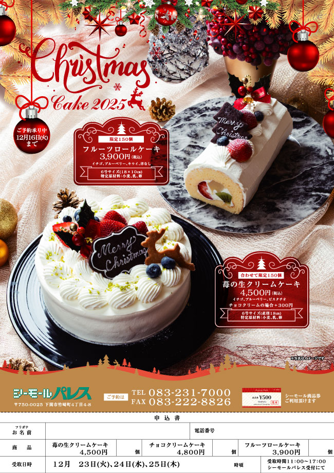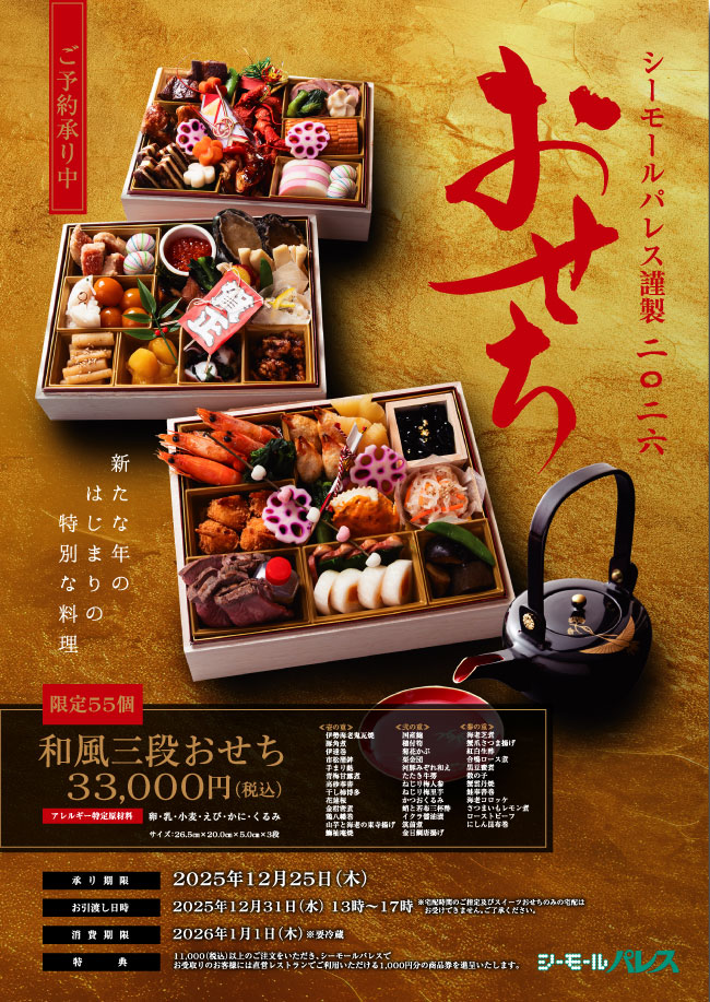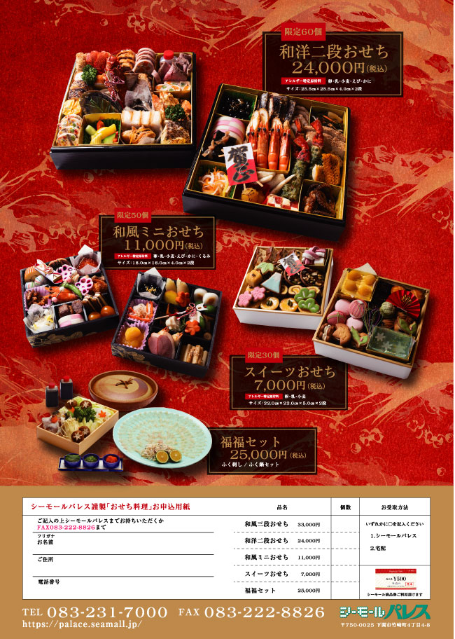 ご予約は、シーモールパレス【083‐231-7000】まで。